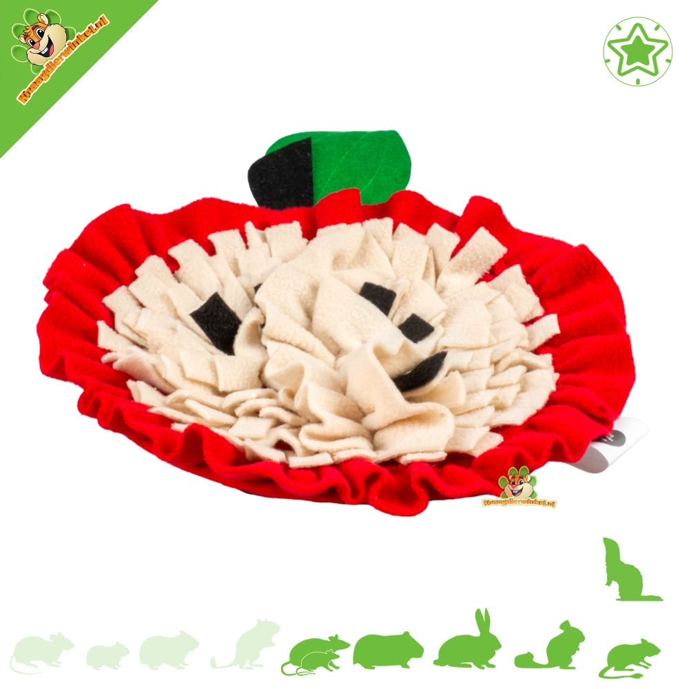 Die Apple Snuffelmat ist eine kuschelige und weiche Beschäftigungsmatte, die Nagetiere und Kaninchen zum Schnüffeln, Suchen und Erkunden anregt. Verstecken Sie Leckerlis oder Trockenfutter zwischen den Fleecestreifen und lassen Sie Ihr Haustier sich auf spielerische und aktive Weise beschäftigen. Diese Form der geistigen Anregung ist ideal, um Langeweile zu bekämpfen und das Wohlbefinden zu fördern.