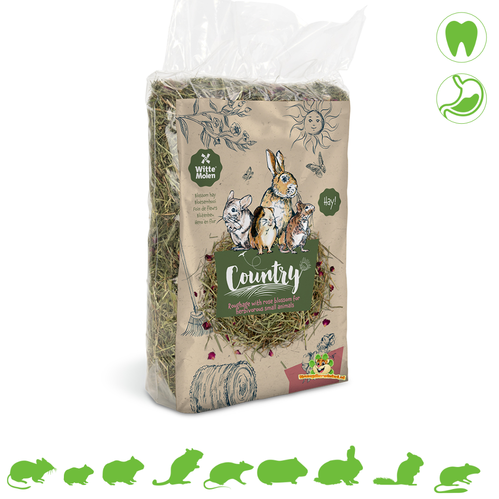 Witte Molen Country Blütenheu für pflanzenfressende Kleinnager und Kaninchen versetzt Sie in einfachere Zeiten zurück. Sonnengetrocknetes, ballaststoffreiches Heu direkt von der Wiese, zu einem fairen Preis von der Brabanter Witte Molen, die seit 1740 besteht. Dieses natürliche Blütenheu, angereichert mit köstlichen Rosenblüten, ist ein Muss für jedes Kaninchen, Meerschweinchen, Chinchilla und Degu. Stundenlange Unterhaltung garantiert!