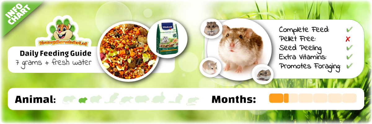 Goed voer voor Russische dwerghamsters. Vooral voor kleintjes. Ik mis de zonnepitjes en erwtenschijfjes erin.