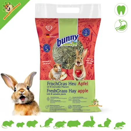 FreshGrass Apfelheu ist hochwertiges, frisches Grasheu mit Apfelgeschmack für mehr Abwechslung und Geschmack im Futtertrog. Das Heu wird in geschlossenen Räumen getrocknet und von Hand verpackt. So entstehen schöne, lange, knackige Halme, die Tiere gerne picken und knabbern. Es eignet sich hervorragend als tägliches Hauptfutter für Kaninchen und größere Nagetiere und macht die Futtersuche zudem etwas interessanter.