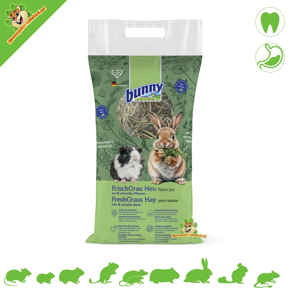 Bunny Nature FreshGras Heu ist nicht irgendein Heu. Es ist Premium-Heu von höchster Qualität! Gut zu wissen, dass das Heu in Innenräumen getrocknet und von Hand verpackt wird. Auch wenn es zunächst zeitaufwändig erscheint, ist dies die einzige Möglichkeit, schädliche Pflanzenarten, die bei der Ernte vorkommen, zu trennen. Darüber hinaus sorgt das Handverpacken für schöne, lange Heuhalme, die ihren maximalen Nährwert behalten. Ein häufig verwendeter Heuhalm verliert wichtige Nährstoffe.