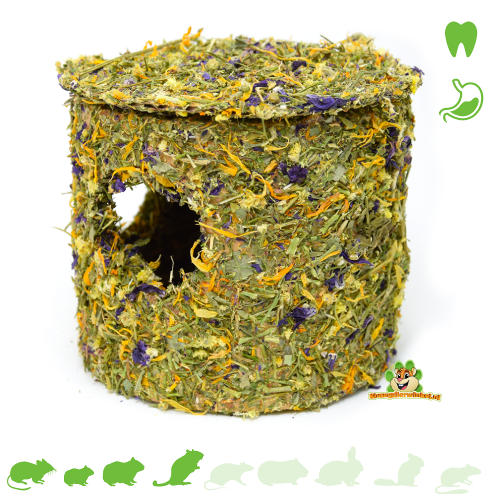 100% natürliches Kräuterhaus mit Blumen, ausgekleidet mit duftenden Kräutern und Blumen. Ideal als Versteck und essbarer Snack für kleine Nagetiere.