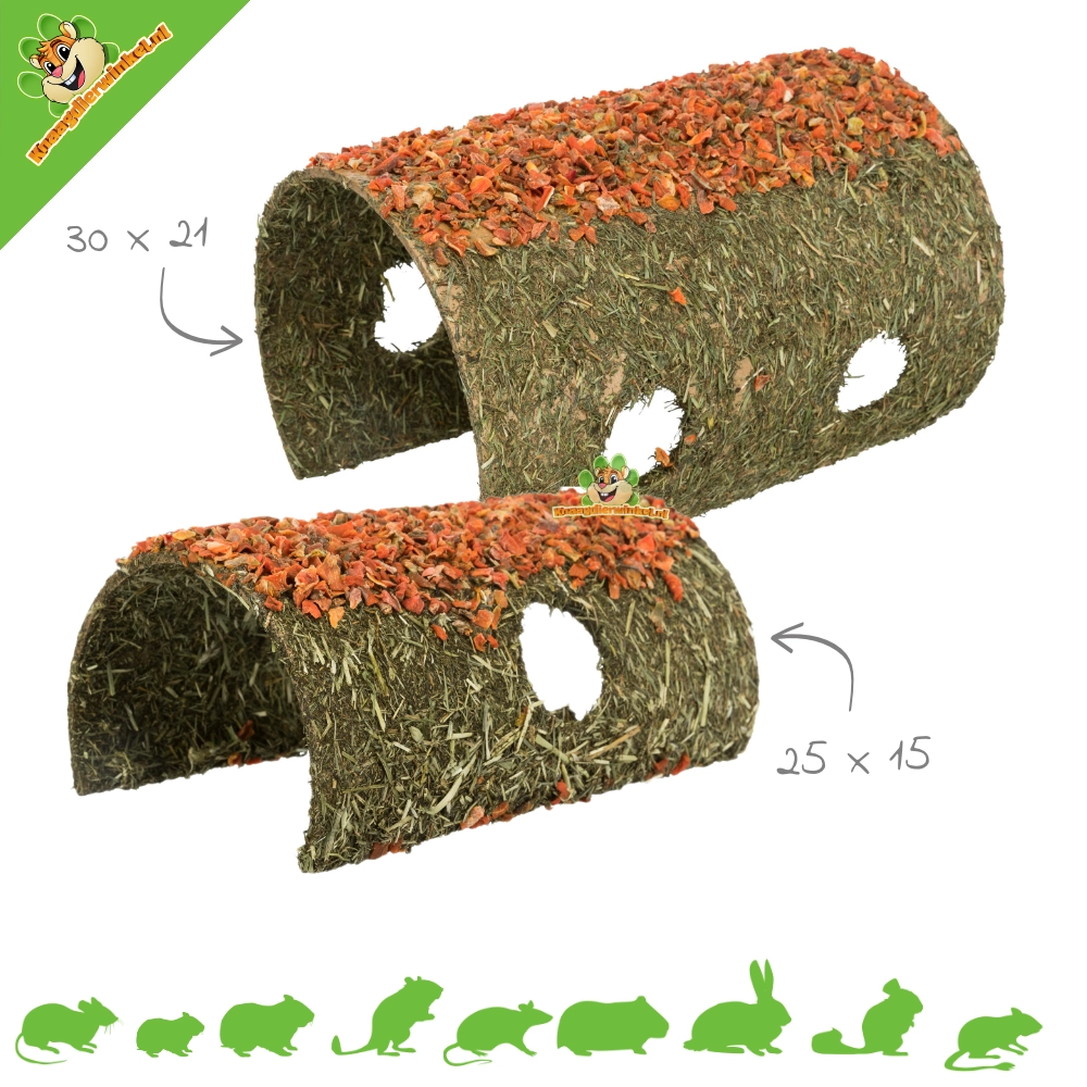 Der Heutunnel mit Karotte ist viel mehr als nur ein Versteck. Er ist eine multifunktionale Bereicherung für jeden Nagetier-Lebensraum. Ob Ihr Haustier hindurchläuft, darin schläft, ihn auseinanderzieht oder einfach nur daran nagt – dieser Tunnel macht den Tag Ihres Tieres noch ein bisschen lustiger. Die getrockneten Karottenstreifen sorgen für zusätzliche Ballaststoffe und einen gesunden Snack, während der Tunnel selbst zur Zahnpflege beiträgt.