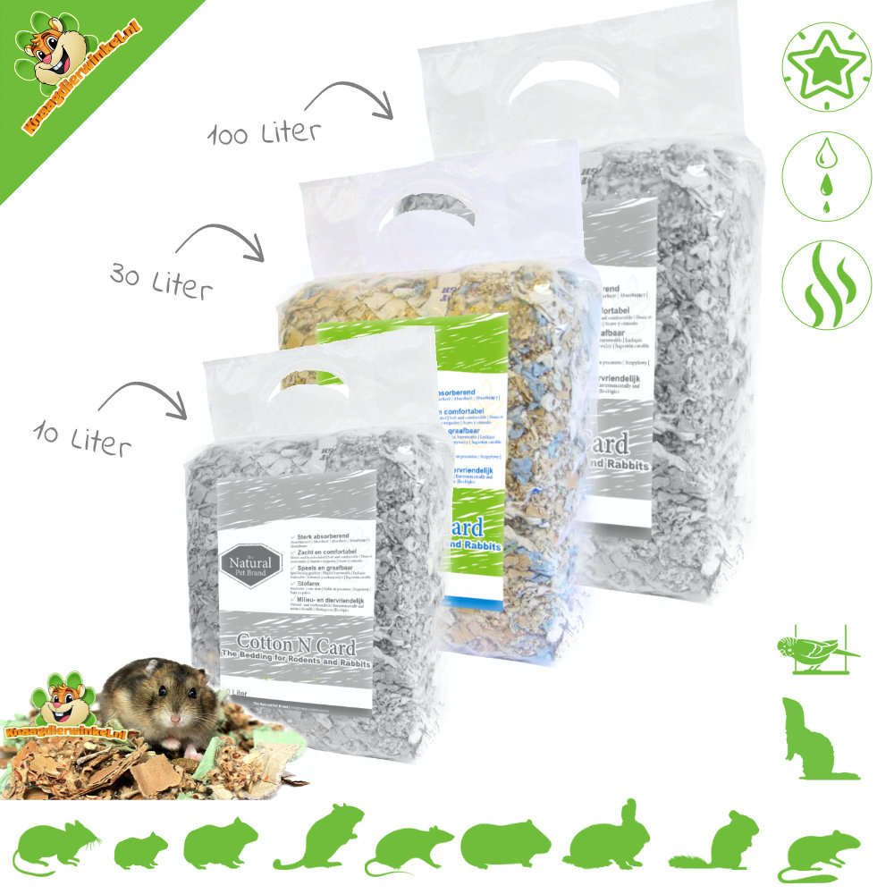 Ik koop de cotton n card altijd voor mijn hamsters. Ik vind het zo"n leuke bodembedekker. De dieren kunnen er lekker mee aan de slag en ze spelen er ook mee. Vooral en doorheen kruipen en onderdoor kruipen en de kartonstukjes nog verder versnipperen.