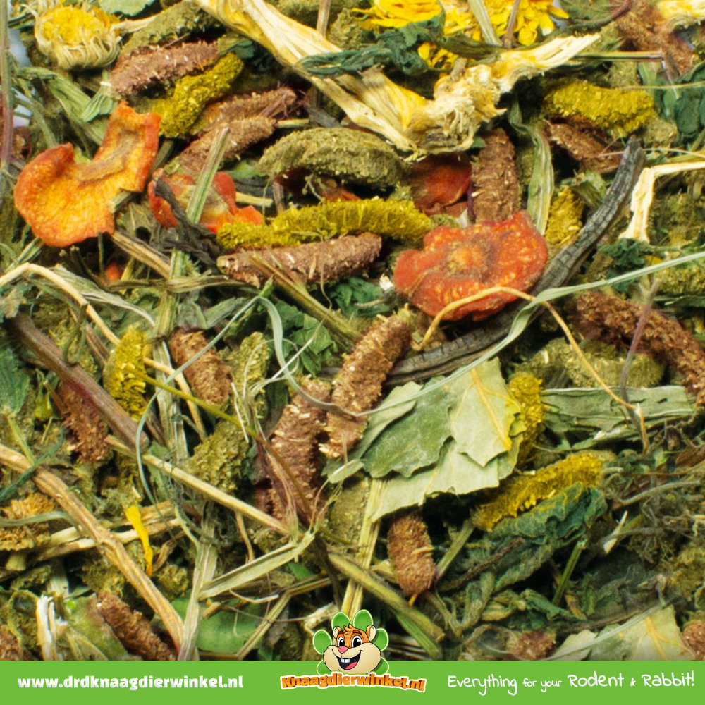 Wachstum von Dauergrünland in den Alpenvorgebirgen (bestehend aus Wiesenlieschgras, Fuchsschwanzgras, Hafer, Knöchelgras, Flaumhafer, Wiesen-Federgras, Rotklee, Hahnenfuß, Steingras, Wolliges Honiggras, Goldhafer, Schmalblättriger Wicke, Hopfenwicke), Flusskrebsen, Wiesenprimel, Gänseblümchen, Gänseblümchen, Rizinus, Wiesenlabkraut, Pastinake, Sauerampfer, Ehrenpreis, Hornkraut, Deutschem Weidelgras, Weichem Trespe, Vogelwicke, Wicke, Dreizahn-Knabenkraut, Ambrosia, Hahnenfuß, Kleiner Ambrosia), Erbsenflocken, Gemüsefasern, Karotten (5,6 %), Brennnessel, Spitzwegerich, Ringelblumenblüten, Rote Bete, Leinsamen (1,4 %), Fenchelsamen, Brennnesselwurzeln, Ackerbohnenflocken, Pfefferminze, Pastinake, Erdbeerblättern, Kamillenblüten, Hanfsamen, Schwarzkümmel, Zitrone Melisse, Kurkuma, FOS, Sanddorn, Blaubeeren, Himbeeren, Bohnenpflanze, Majoran, Anis, Kieselsäure, Fenchel, Holunderblüte, Lavendelblüten, Rosmarinblätter, Salbeiblätter, Thymian, Yucca.