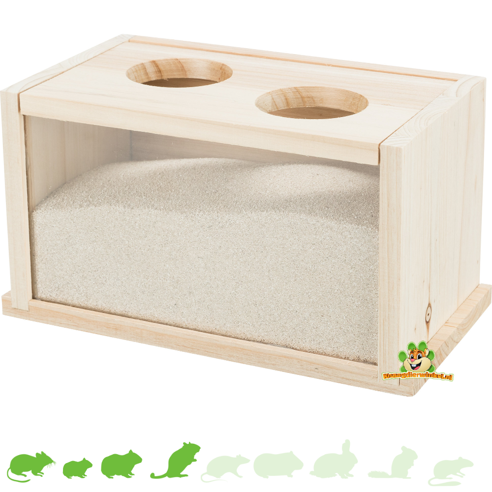 Mit diesem praktischen Sandkasten von Trixie kann der Buddelspaß beginnen. Er ist aus unbehandeltem Naturholz gefertigt, hat zwei Eingänge und ein schönes Sichtfenster aus Plexiglas an der Vorderseite. Befüllt mit Chinchillasand können die Tiere baden und sich putzen, während ihre Besitzer zusehen!