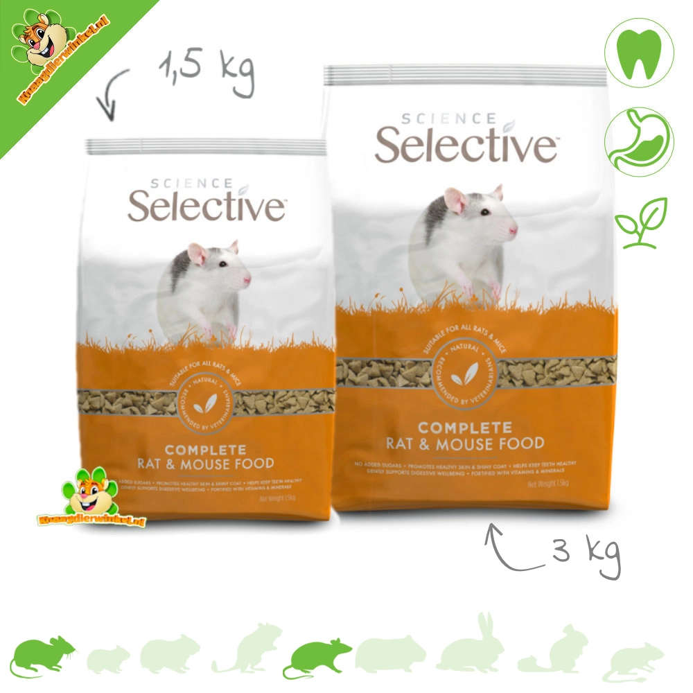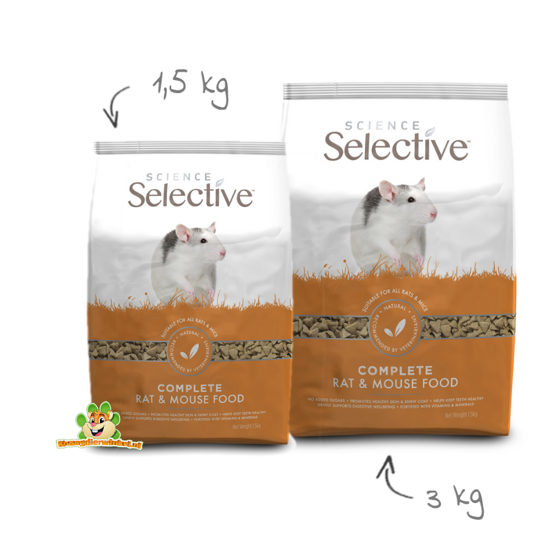 Supreme Selective Rat & Mouse ist ein vollwertiges Pelletfutter für Hausratten , Zwergratten und (farbige) Mäuse . Da jedes Pellet die gleiche Zusammensetzung hat, wird selektives Fressen verhindert: Ihre Haustiere können sich nicht nur die leckeren Stücke herauspicken.