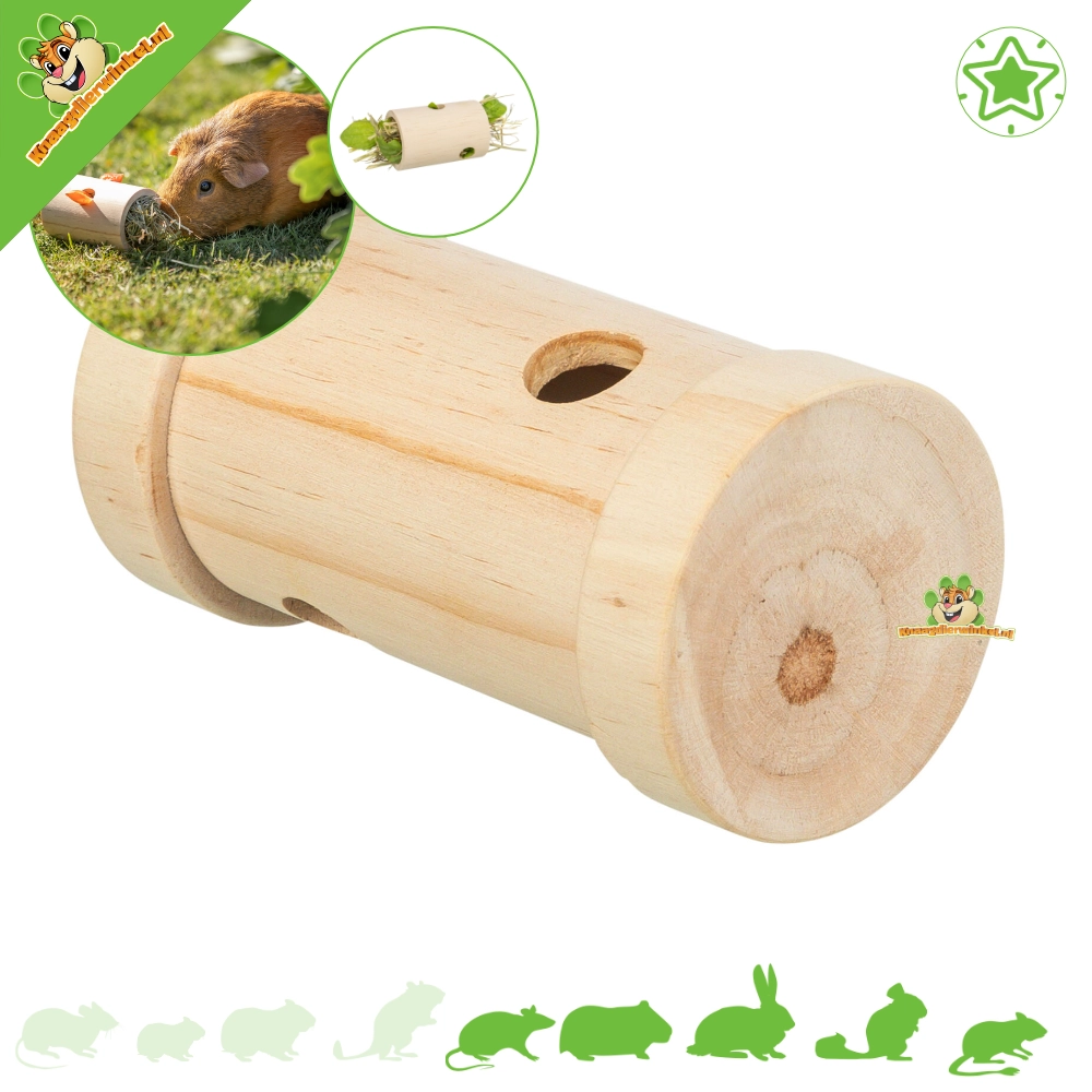 Die Futter-Snack-Rolle aus Holz (11 cm) ist das perfekte Spielzeug für neugierige Nager! Die Naturrolle kann mit Snacks oder Heu gefüllt werden und sorgt für Abwechslung, Bewegung und Herausforderung. Sobald das Tier die Rolle bewegt, fallen Belohnungen heraus – ein Riesenspaß und anregend!