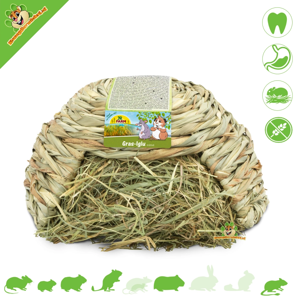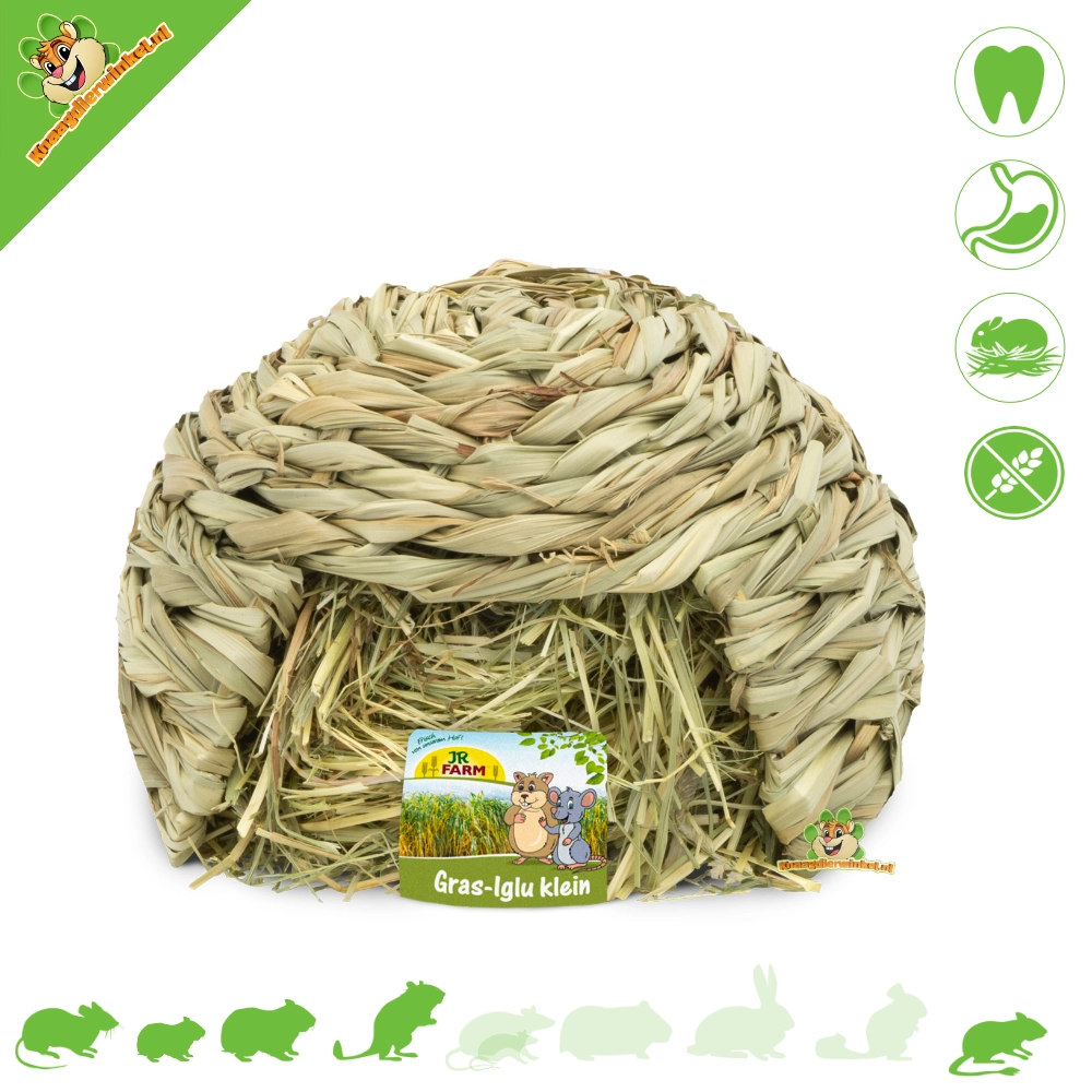 The JR Farm igloo is made from 100% natural miscanthus grass, which naturally has a very high content of raw fibers. The igloo is filled with fragrant mountain hay and can of course be refilled again and again. The igloo itself is untreated and completely edible.