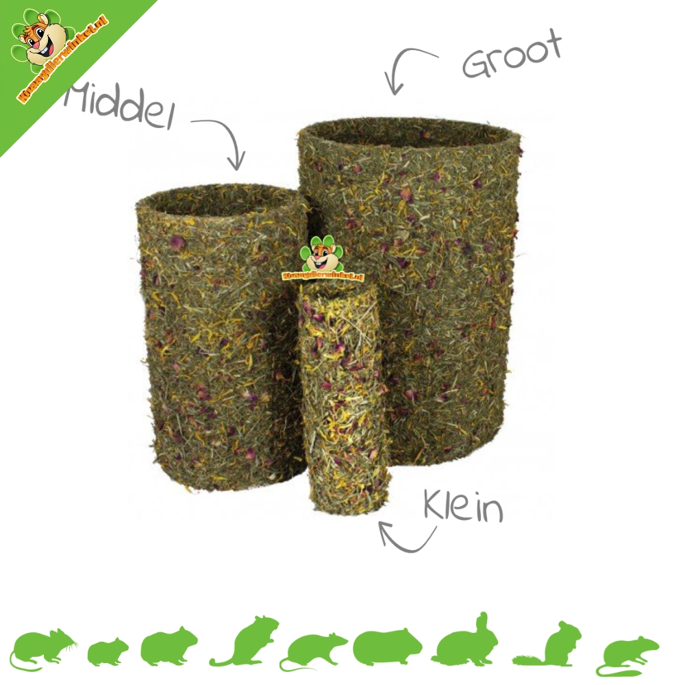De rol bestaat uit een kartonnen board rol die minimaal bekleed is met de grassen en bloemen. Deze laten ook heel gemakkelijk los, ik moest minstens een derde uit de verpakking los schudden zodat ze het konden eten, want het had al losgelaten van de rol. Mijn muizen kunnen de kartonnen rol wel heel erg waarderen, vandaar nog 3 sterren, maar mij viel het toch een beetje tegen.