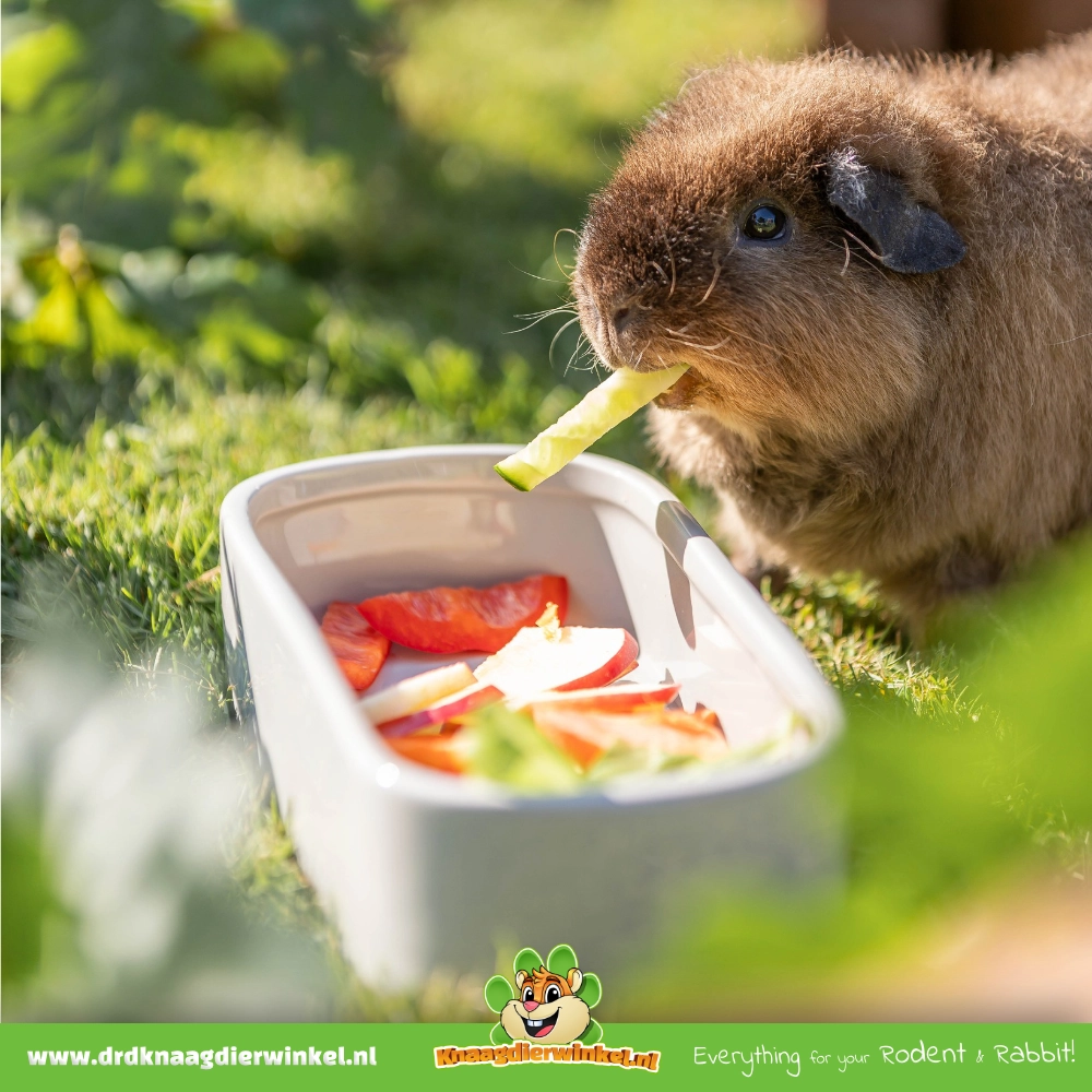No more hassle with juggling multiple food bowls, this food bowl offers space for multiple animals and that is very important for social animals so that they do not fight over the food bowl. Guinea pigs, rabbits, chinchillas and degus like to eat together, thanks to the lower design this coziness is made possible.