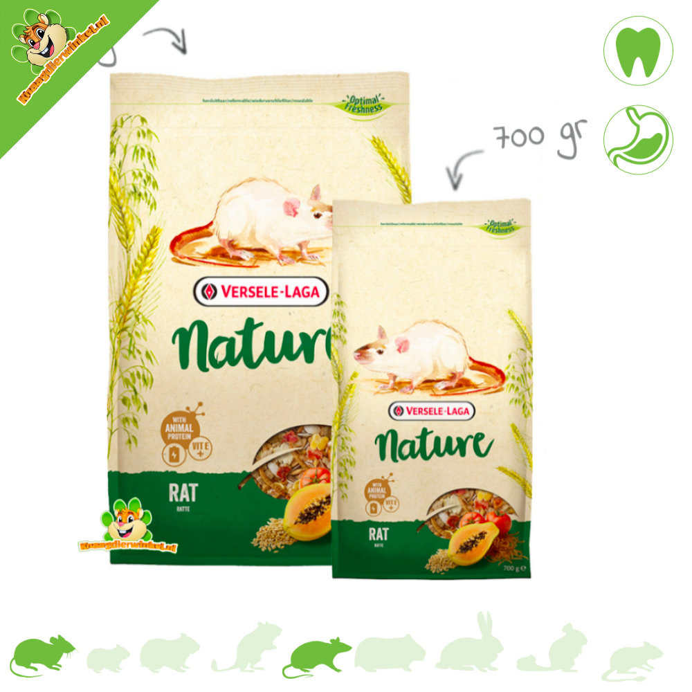 Versele Laga Nature Rat Food is a complete food tailored to the nutritional needs of pet rats and dwarf rats . This premium blend of natural ingredients contains all the essential nutrients, vitamins, minerals, and amino acids your pet needs for a carefree and healthy life full of vitality. Rat Nature contains extra grains, seeds, nuts, fruit, herbs, vegetables, and health-supporting supplements: for excellent digestion, good dental care, a shiny coat, and excellent health. The wide variety of ingredients guarantees high palatability and absorption.