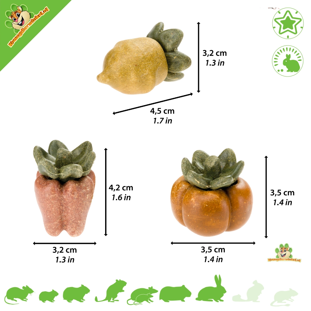 Veggie Bites Vegetables are a cheerful and healthy treat for rodents and rabbits. This set of three colorful vegetable figurines is made with natural, fiber-rich ingredients like oat bran, wheat straw, timothy hay, and vegetables like carrots, pumpkin, and beetroot.