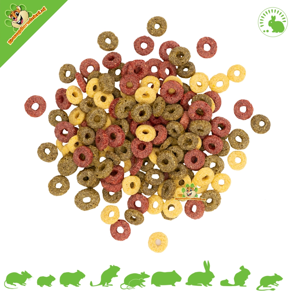 Ofrece estos deliciosos anillos como una divertida y sabrosa recompensa para tus roedores y conejos. Asegúrese de que siempre haya agua potable disponible y tenga en cuenta el tamaño de las porciones para mantener una dieta equilibrada.