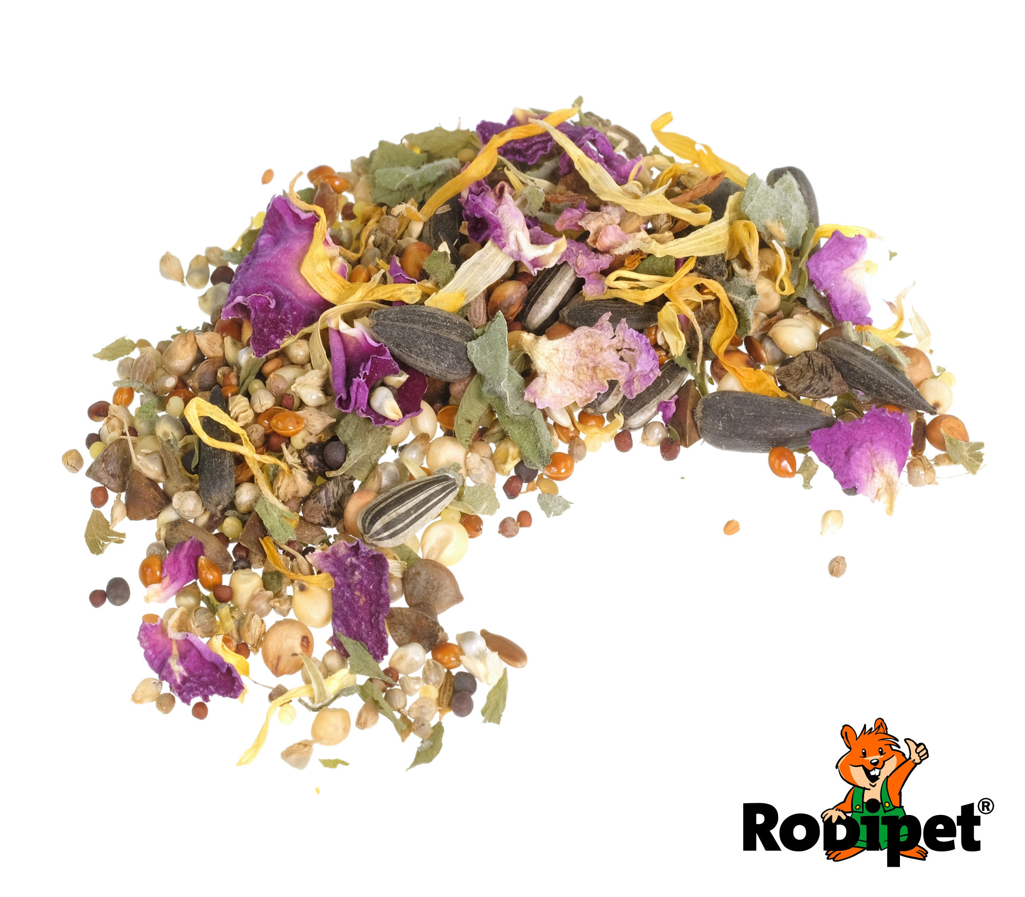 A este alimento no se le han añadido vitaminas. Por tanto, el consejo de Rodipet es complementar esta dieta con proteínas animales, hierbas y verduras frescas.