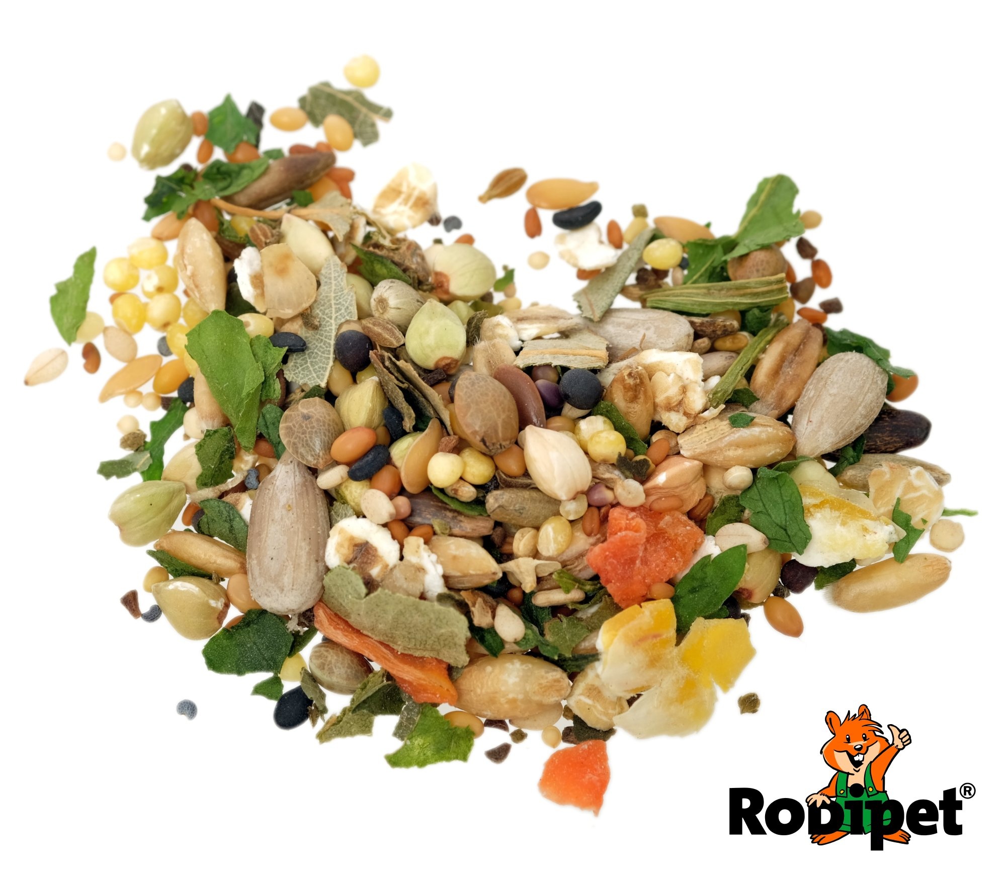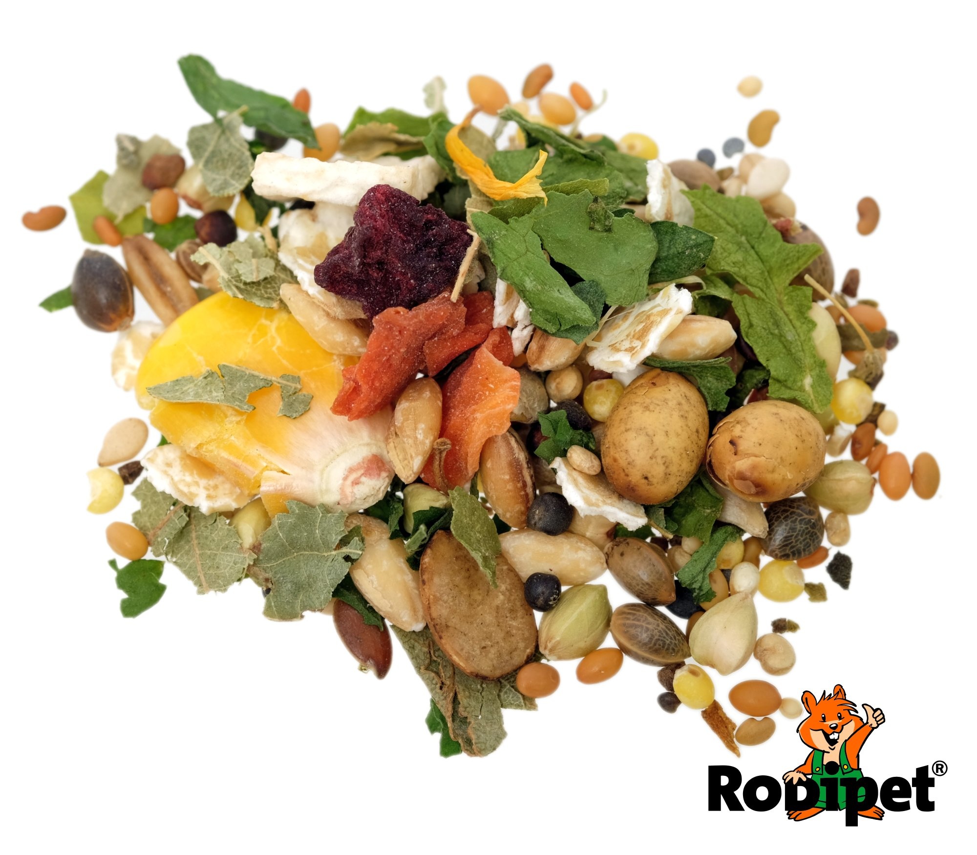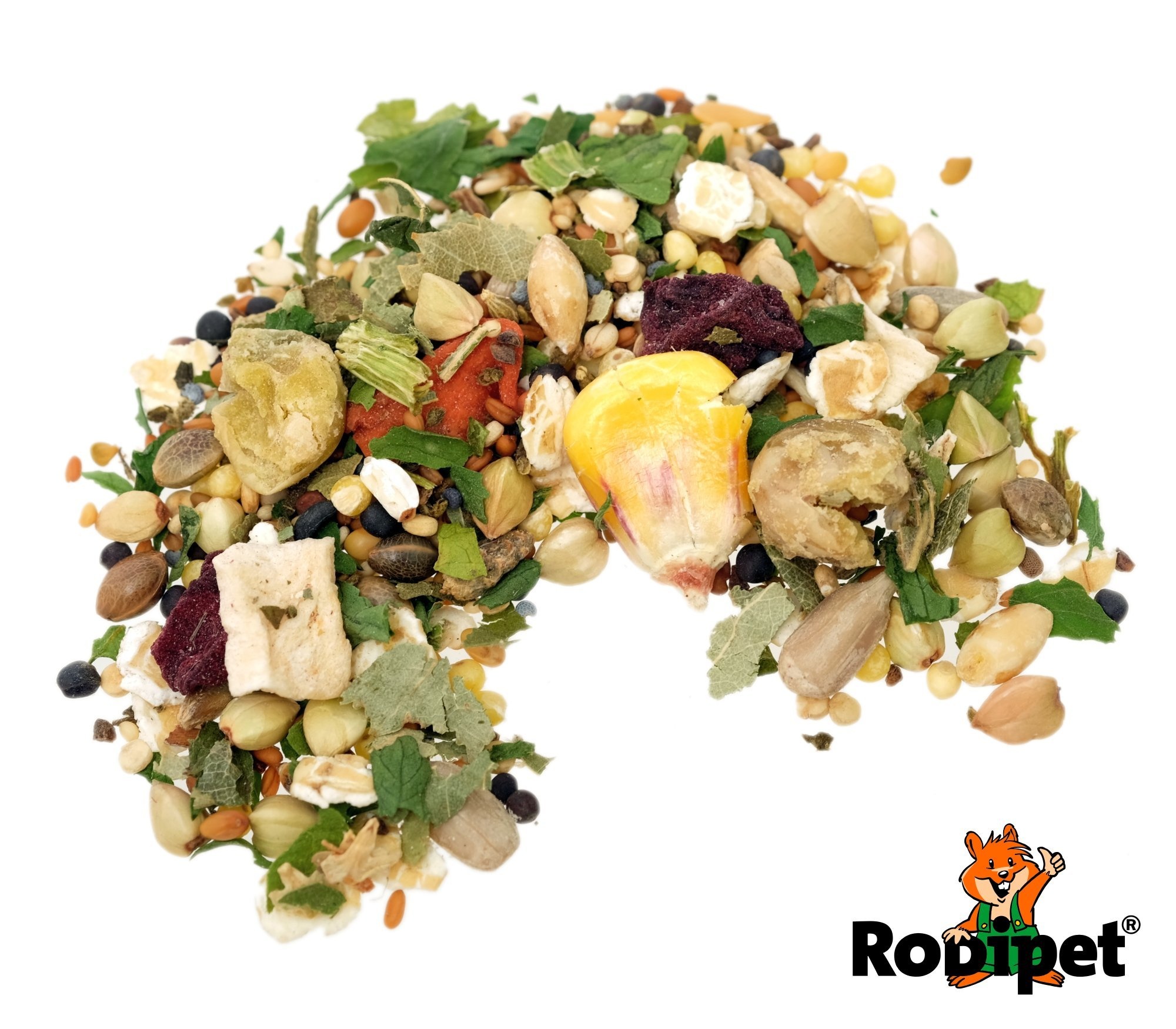 Este alimento no contiene vitaminas. Por lo tanto, Rodipet recomienda complementarlo con proteínas animales, hierbas y verduras frescas.