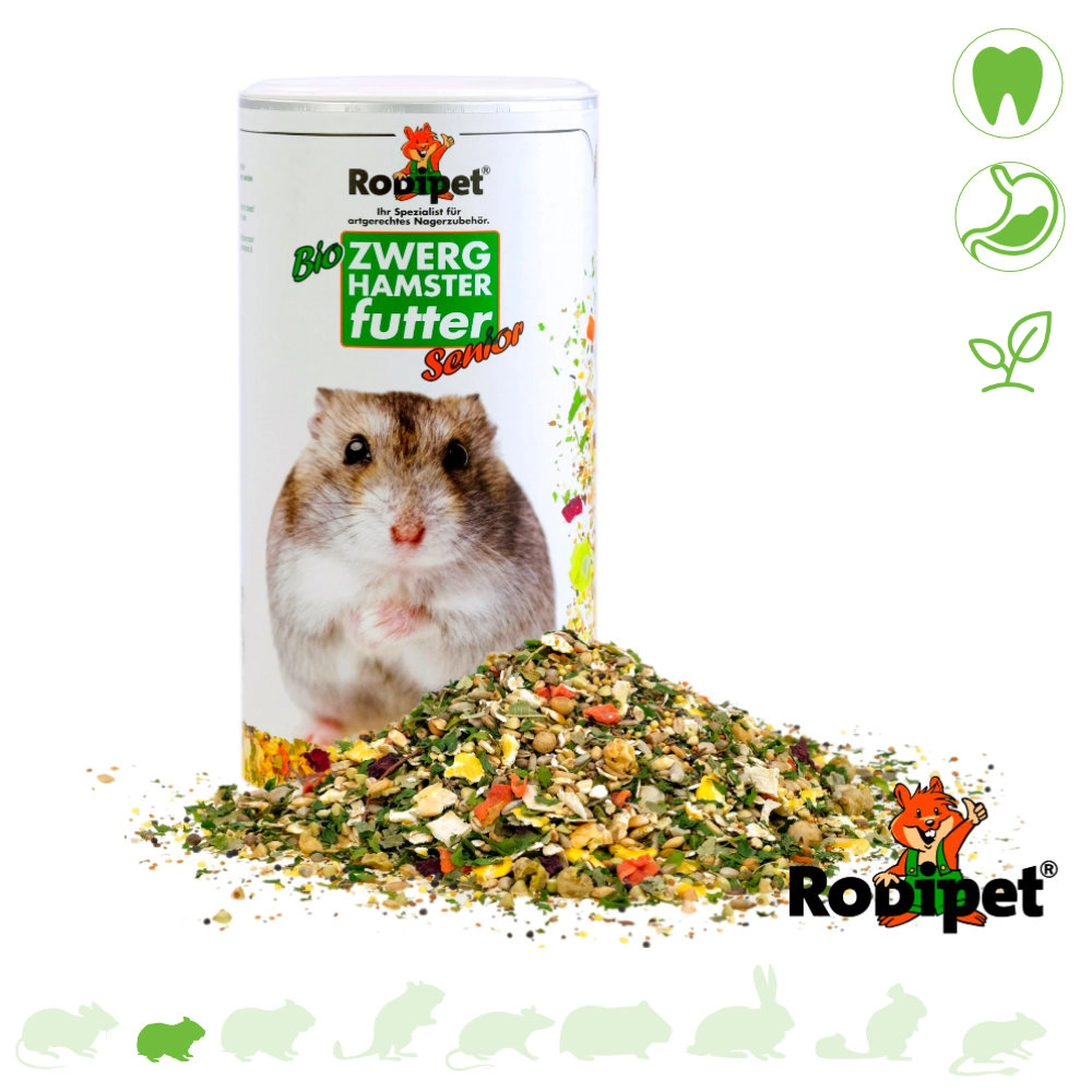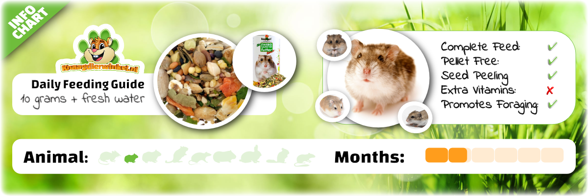 Alimento para hámsteres enanos , especialmente formulado para hámsteres enanos, como los hámsteres enanos Roborovski , los hámsteres enanos chinos , los hámsteres enanos rusos y los hámsteres enanos de Campbell , a partir de los 13 meses de edad. Esta mezcla de alimento, apropiada para la edad de los hámsteres enanos jóvenes, se basa en la dieta que consumirían los animales en estado salvaje.
