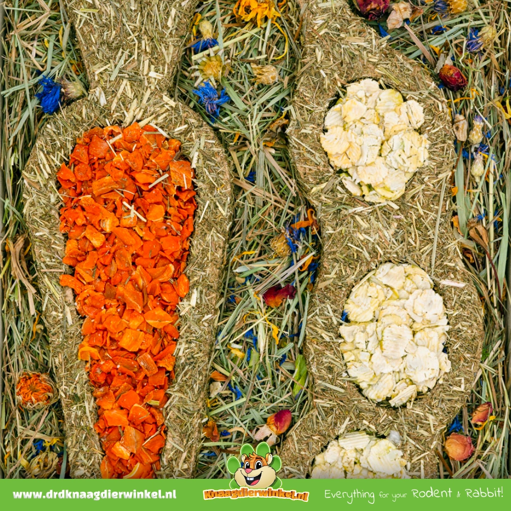 | Composición: | Heno de pradera de montaña 53,8%, lignocelulosa, zanahorias 8,7%, copos de guisantes 7,6%, almidón vegetal, flores de rosa, flores de caléndula, pétalos de aciano |