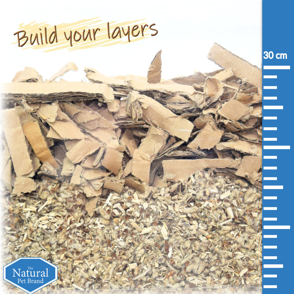 Llene el recinto hasta que el fondo esté completamente cubierto con cartón y cartón marrón. Una capa de 10 a 15 cm es suficiente, siempre que el fondo esté completamente cubierto.