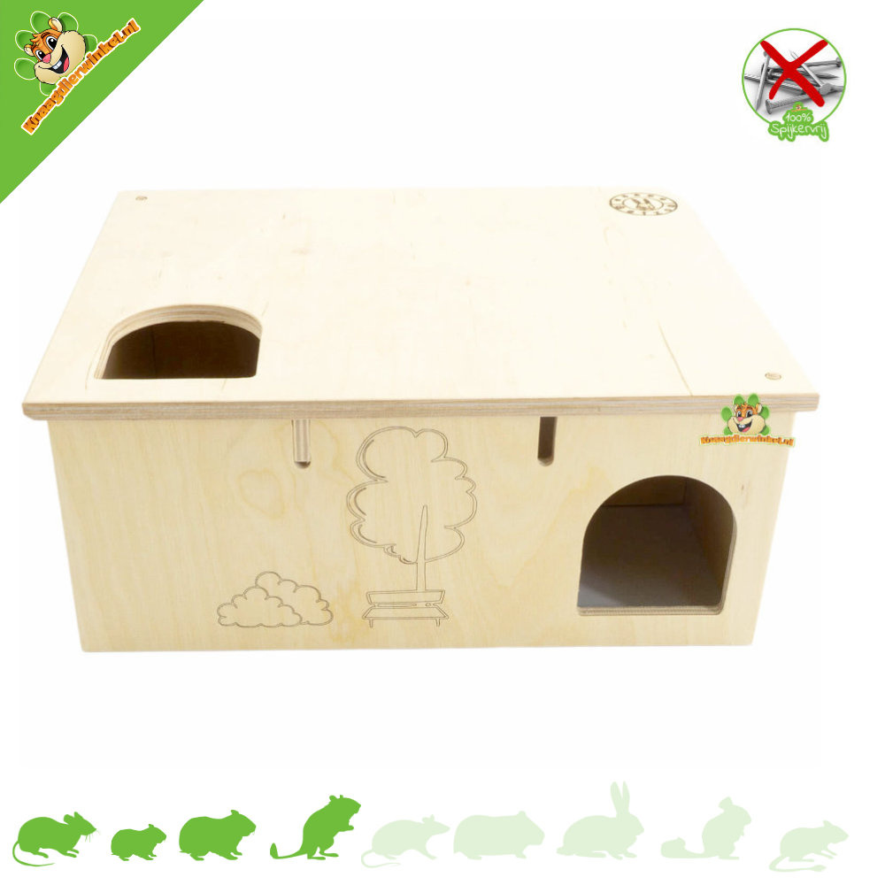Het is een leuk huisje,mijn hamster is er helemaal fan van sinds de eerste dag dat hij hem in z'n verblijf heb. En hij heeft hier ook zijn nest in gemaakt. Maar hij plast hier ook in. Wat ik heel jammer vind is dat je die urine aan de andere kant ziet en het helemaal in het hout is gaan zitten. Je ziet aan de buitenkant nu twee grote vochtige plekken zitten.