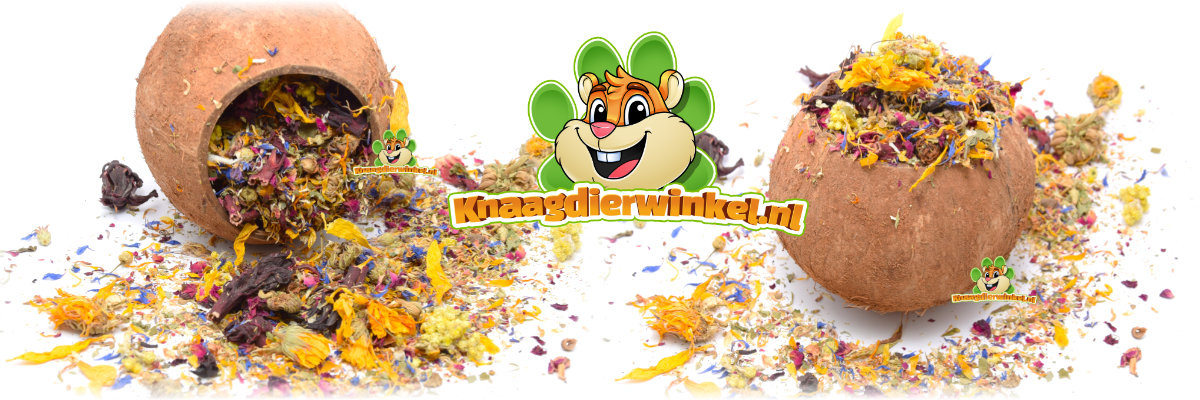 ¡Un coco vacío es ideal para usarlo como plato de comida "divertido"! Por "diversión" nos referimos a un comedero que se puede volcar o que los animales pueden lanzar al aire. Por ejemplo, hemos rellenado el coco con una bonita mezcla de flores, que se vende por separado (consejo), pero el coco también se puede rellenar, por ejemplo, con heno u otras hierbas. ¡La nuez es 100% natural!