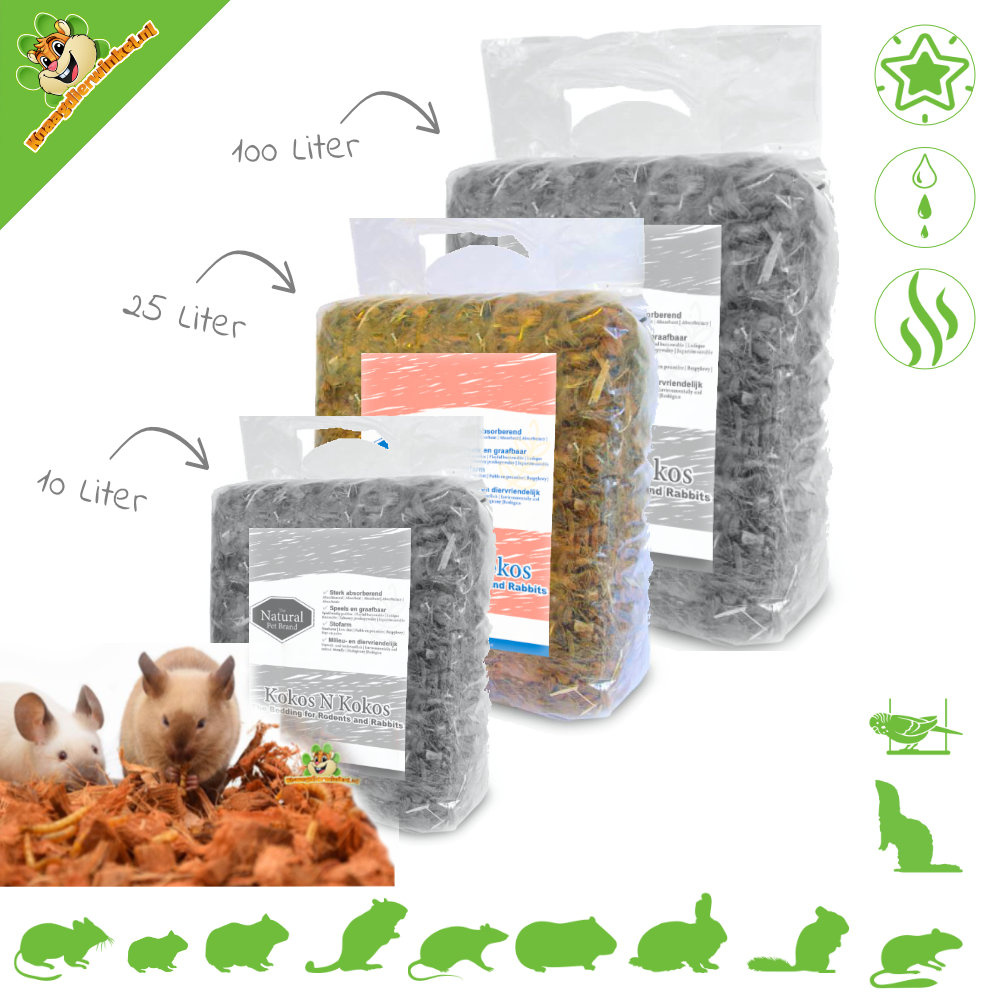 Wij gebruiken de kokos als bodem bedekking voor de binnenhokken en de konijnen toiletten in het konijnenhok. Één van onze konijnen krijgt ontstoken ogen van hooi, voorheen gebruikten we daarom geperste strokorrels. Dit is een goed (en licht) alternatief voor geperste strokorrels. Je hebt er minder van nodig, het gaat minstens zo lang mee en het hok blijft droog.