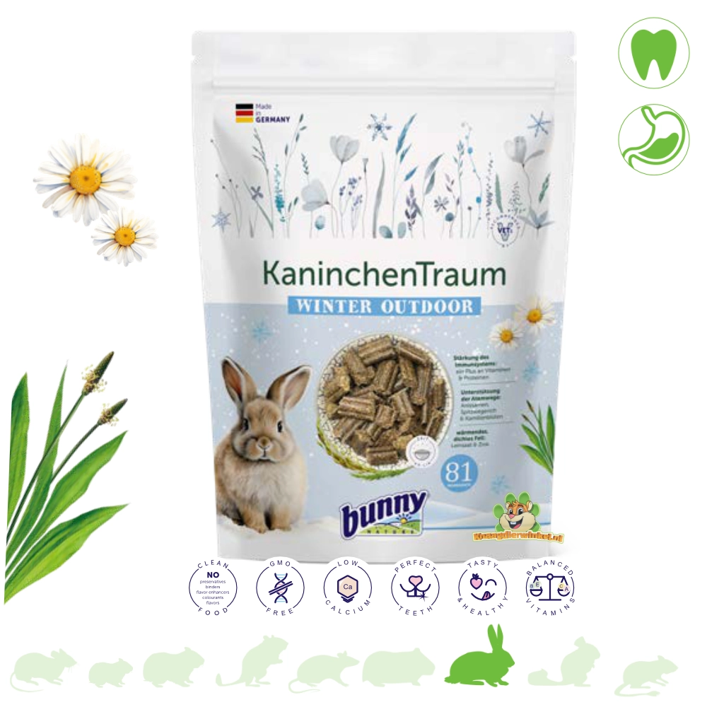 En invierno, la vida al aire libre suele exigirle un poco más a un conejo: temperaturas fluctuantes, días lluviosos y mayor consumo de energía debido a la regulación térmica. Bunny Nature KonijnenDroom Winter Outdoor es un alimento completo para conejos adultos criados al aire libre, con una composición adaptada a la temporada invernal.