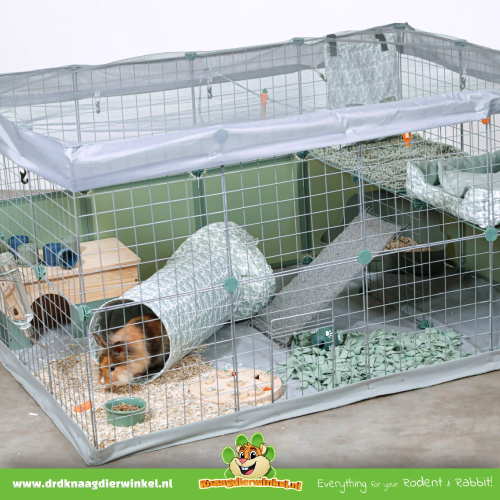 Este recinto ha sido diseñado para conejos enanos y pequeños. Gracias a su diseño bajo y abierto, es ideal para conejos que necesitan principalmente una vista despejada y un espacio continuo.