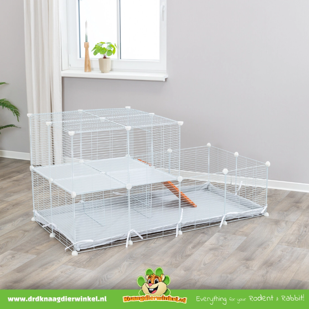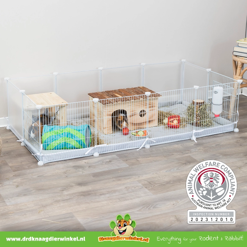 A diferencia de las jaulas tradicionales, esta jaula modular para cobayas ofrece máxima libertad: tú decides la forma, la altura y las opciones de expansión. Ideal para cobayas, que se mueven mucho por naturaleza y se benefician de un recinto espacioso y despejado a ras de suelo.