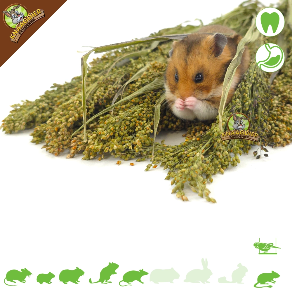 ¡Dale vida y variedad a la casa de tu pequeño roedor con esta hermosa cosecha de mijo seco! Estas plumas de mijo naturales no sólo son un refrigerio sabroso y saludable, sino también un atractivo enriquecimiento para el recinto.