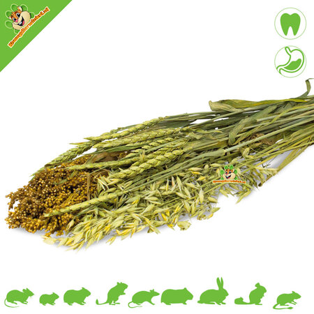 Para ratones, hámsteres enanos, hámsteres, jerbos y ratas, precisamente eso es lo que hace que este tipo de productos cosechados sean tan apetecibles. Las semillas aún están adheridas a la planta, lo que significa que comerlas requiere un poco más de tiempo y atención. Esto hace que el producto no solo sea sabroso, sino también funcional como actividad dentro del recinto.