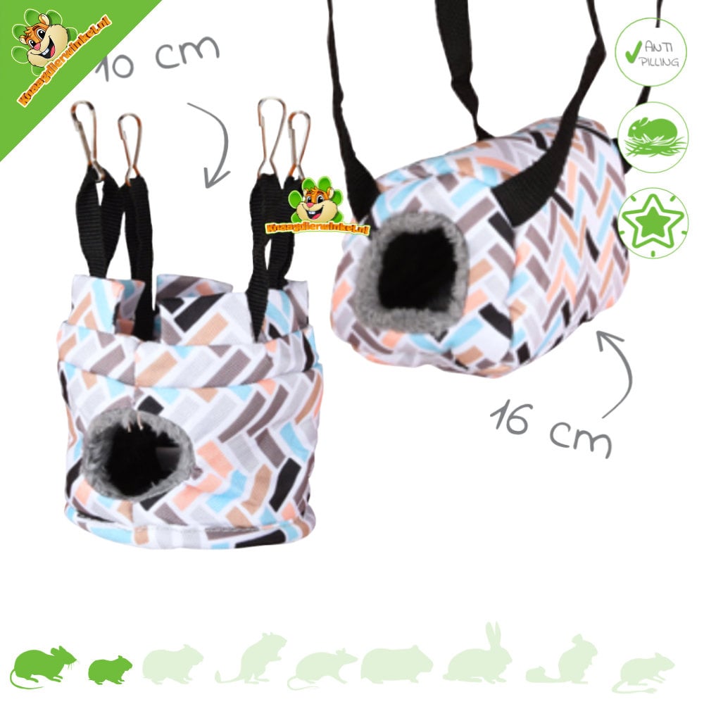 En el caso de los hámsteres y hámsteres enanos, la hamaca debe colgarse un poco más abajo, ya que estos animales no pueden trepar muy bien y no ven la profundidad. Una excepción a esto es el hámster enano chino, que es mejor trepando.