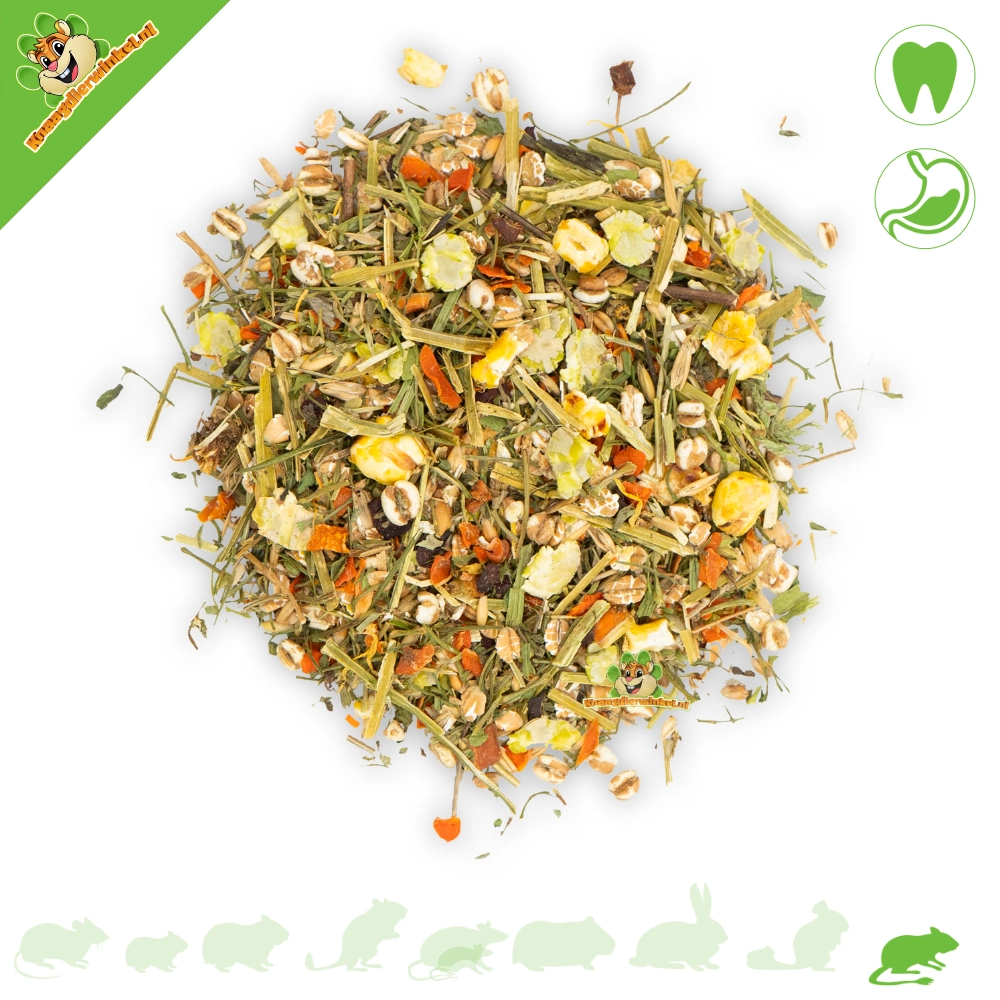 Ingredientes como el perejil, la melisa, la menta, el llantén menor, el diente de león y la caléndula aportan fragancia y variedad. La zanahoria y la remolacha le dan un sabor reconocible a la mezcla, mientras que el heno constituye la base diaria para una masticación prolongada y un aporte adecuado de fibra.