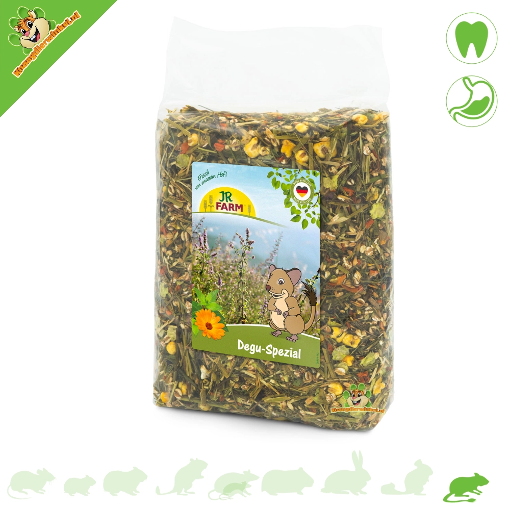 JR Farm Degoe Special es un alimento mixto completo para degús. La mezcla contiene, entre otros ingredientes, copos de avena, copos de trigo, copos de guisantes, zanahoria, perejil, alfalfa, melisa, menta, remolacha, llantén de hoja estrecha, equinácea, flor de caléndula, trébol rojo, diente de león y heno de pradera de montaña.