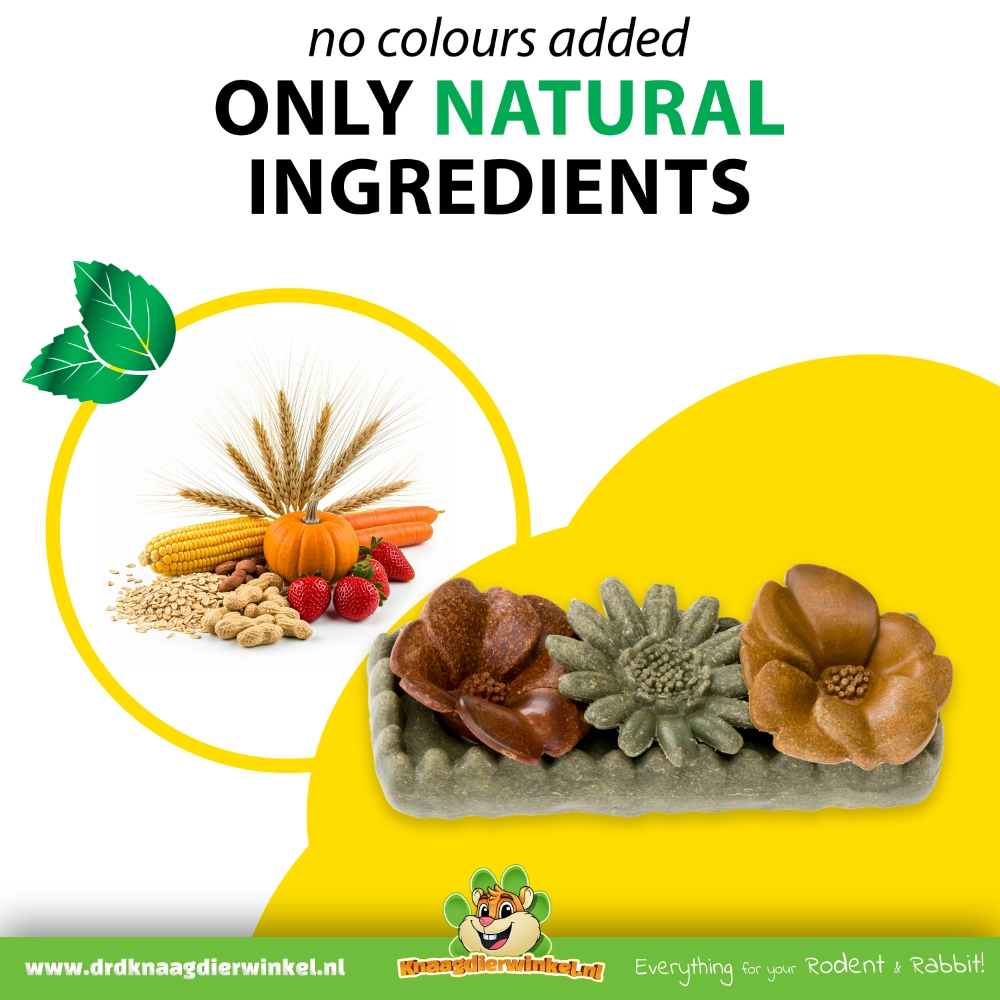 Las Flores Veggie Bites son un bocadillo alegre y saludable para tus roedores y conejos. El set consta de tres flores de formas preciosas sobre una base comestible, elaboradas con ingredientes naturales ricos en fibra como salvado de avena, heno de fleo, alfalfa y extractos vegetales.