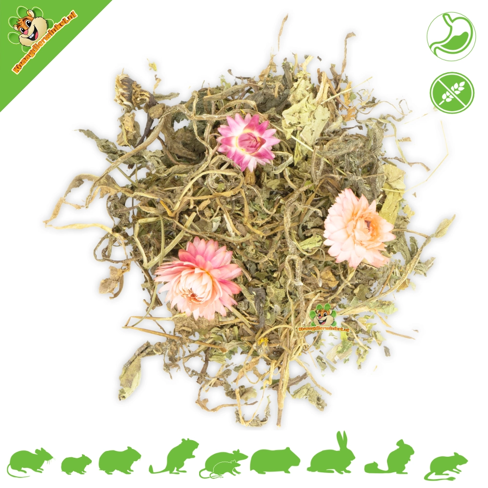 Mezclado con heno u otras hierbas, o como complemento de la dieta diaria.