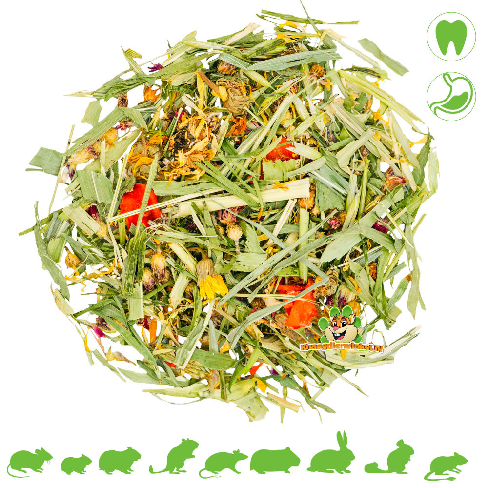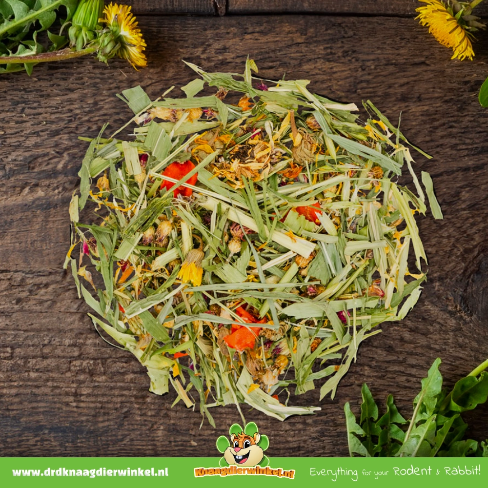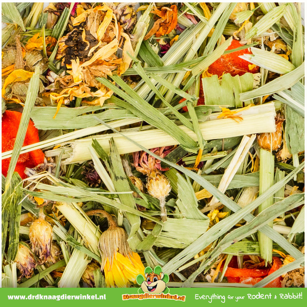 | Composición: | Planta de avena, Copos de guisante 16%, Zanahorias 15%, Planta de maíz, Copos de habas, Aciano, Flores de caléndula, Chirivías, Copos de pimiento. |