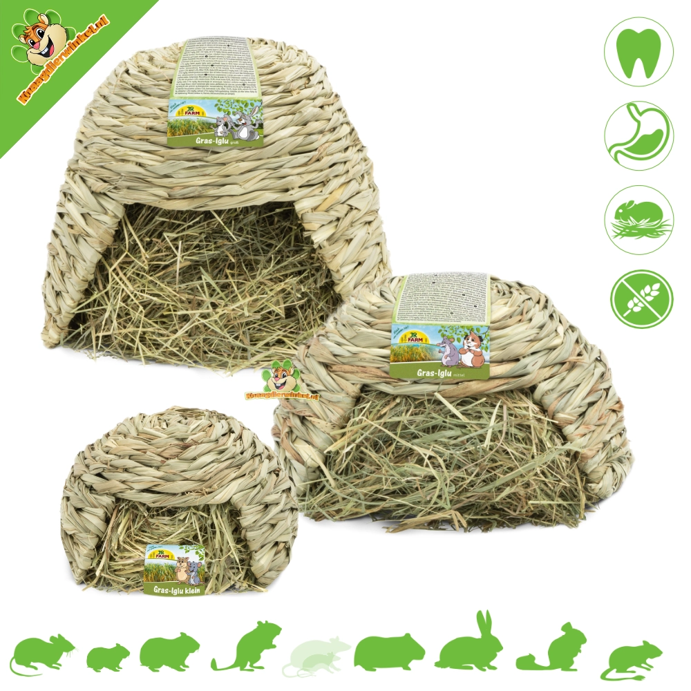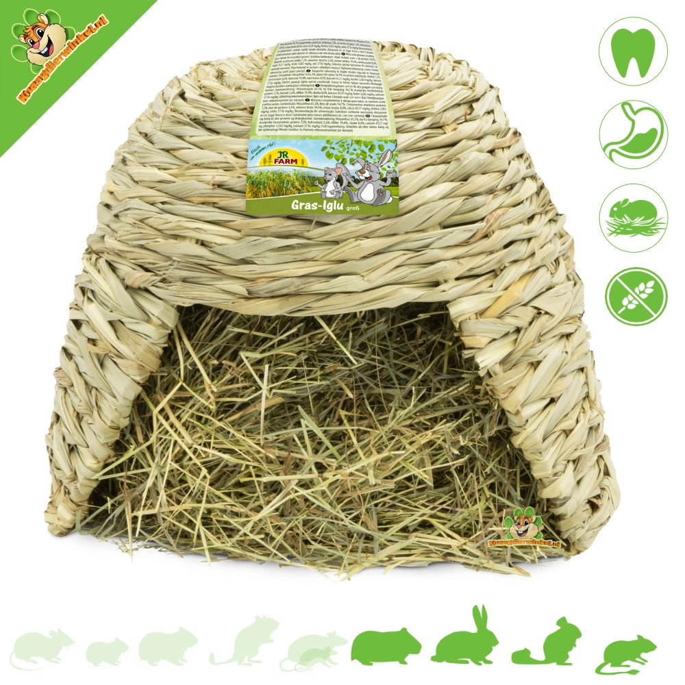 El iglú de JR Farm está elaborado a partir de hierba miscanthus 100% natural, que naturalmente tiene un contenido muy alto en fibras crudas. El iglú está lleno de fragante heno de montaña y, por supuesto, se puede rellenar una y otra vez. El iglú en sí no está tratado y es completamente comestible.