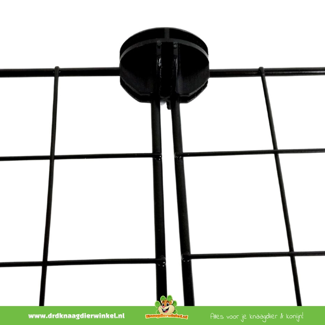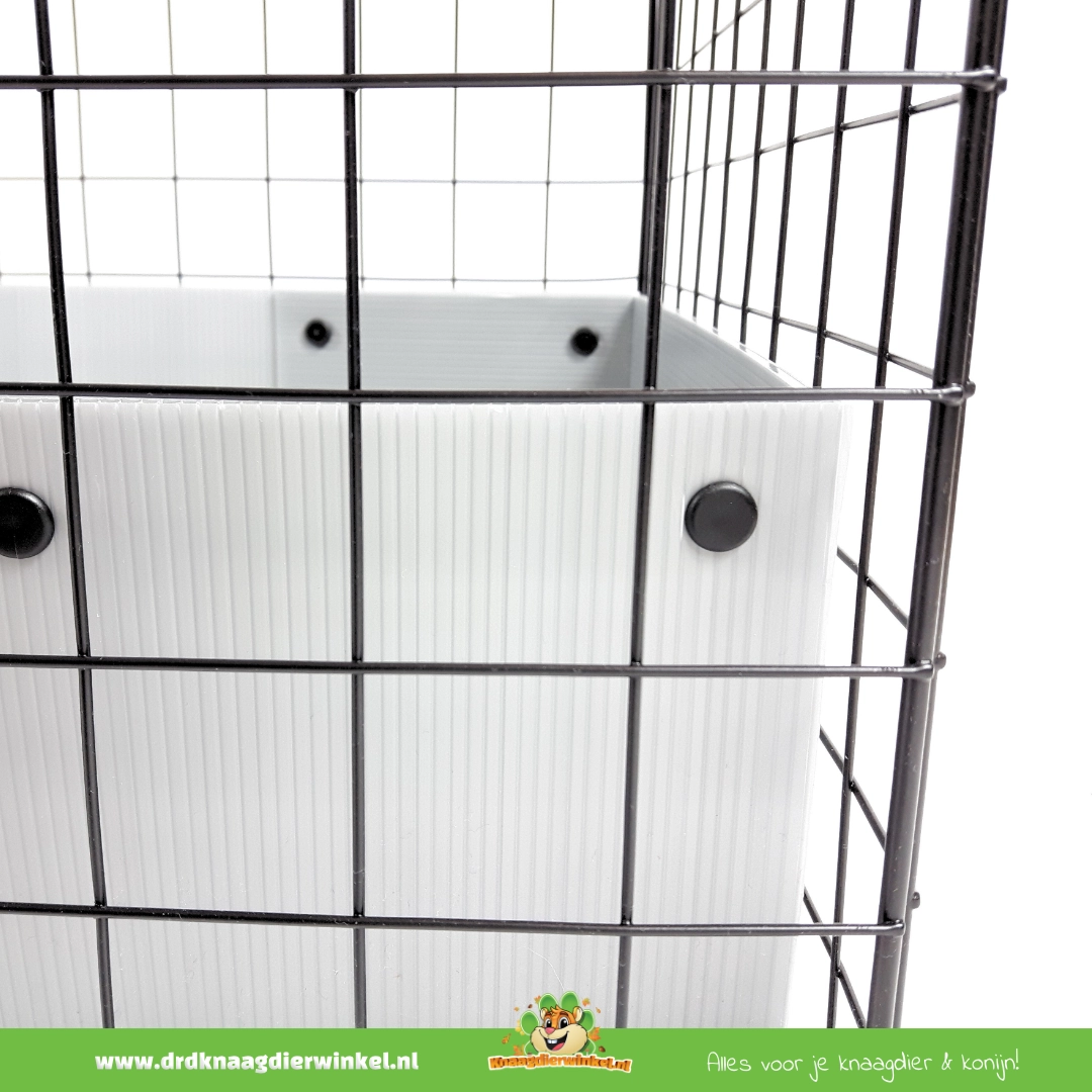 Los paneles C&C® tienen un tamaño fijo de 35 × 35 cm y se unen de forma segura entre sí mediante conectores en cada esquina. Al añadir paneles adicionales a lo largo y/o ancho, se aumenta la superficie del suelo de la jaula.