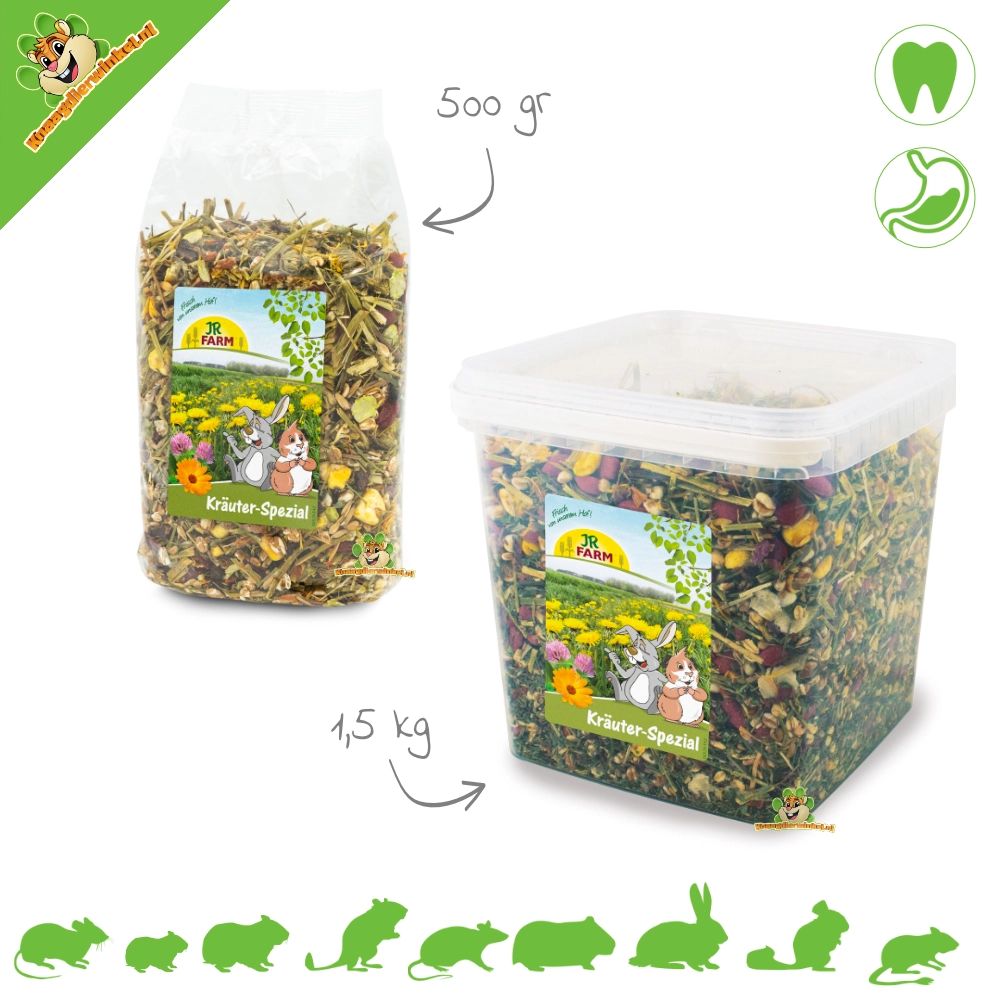 JR Farm Special Herbs está disponible en cubos de 500 gramos y 1,5 kg. Dado que es un alimento complementario, se recomienda administrar pequeñas cantidades. Con 5 gramos al día, 500 gramos durarán aproximadamente 100 días. El cubo de 1,5 kg durará aproximadamente 300 días.