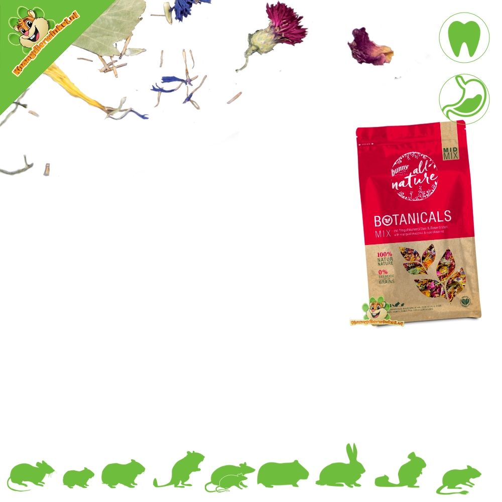 La mezcla Bunny Nature Botanicals Mid Mix es una deliciosa mezcla de hierbas y plantas finamente picadas que se adapta perfectamente a la dieta natural de herbívoros como cobayas, conejos, chinchillas, degús, hámsteres, jerbos, ratones y ratas.