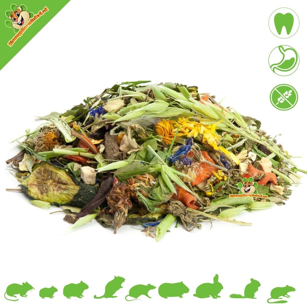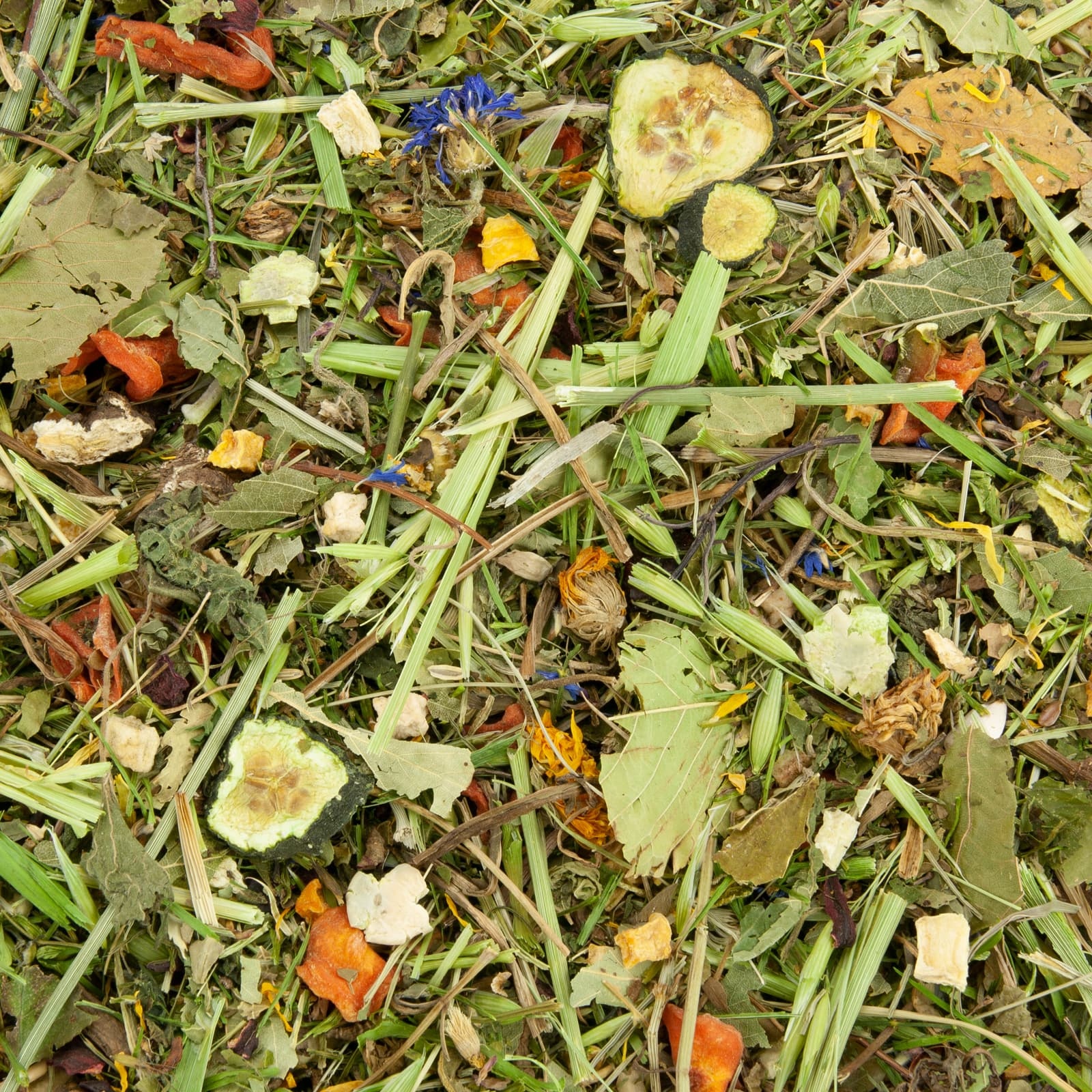10% rodajas de zanahoria, 8% avena verde, 7% eneldo, 6% perifollo, 5% copos de guisantes, 5% raíz de diente de león, 5% hojas de cerezo, 5% cola de caballo, 5% ortiga, 5% diente de león, 3% calabaza, 3% chirivía, 3% hojas de abedul, 3% hojas de avellana, 3% caléndula, 3% hibisco, 2% rodajas de pepino, 2% remolacha, 2% calabacín, 2% brócoli, 2% escaramujos, 2% flor de trébol rojo, 1,5% dados de manzana, 1,5% trozos de plátano, 1% linaza, 1% menta, 1% semillas de cardo mariano, 1% semillas de girasol, 1% semillas de hinojo, 1% aciano azul.