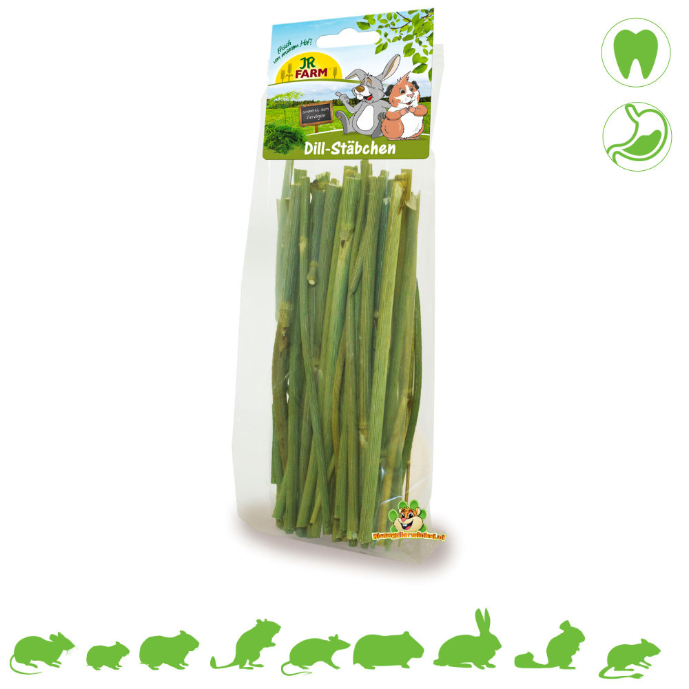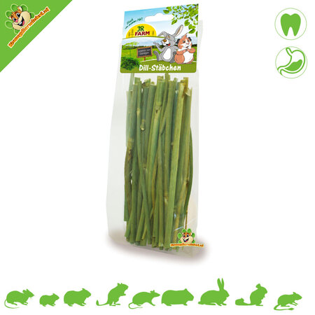 Palitos de Eneldo JR Farm: Palitos crujientes con eneldo para roedores y conejos. Los Palitos de Eneldo JR Farm ofrecen a tu roedor un placer aromático y saludable de una forma realmente original. El eneldo favorece la digestión. También aptos para todo tipo de aves.
