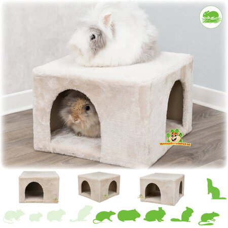 De konijnen liggen er graag in te slapen of klimmen op de bovenkant. De schuilplaats ziet er ook leuk en luxe uit door het pluche.