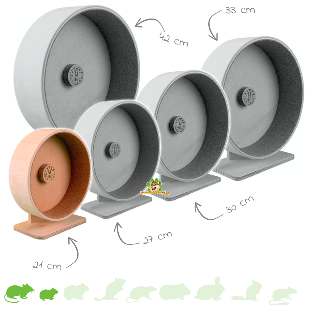 Siempre medimos el volumen a una distancia de al menos un metro de la rueda. Una vez que el roedor pone la rueda en movimiento, lo único que se puede oír desde esta distancia es al animal caminando. Las ruedas de corcho son un poco más silenciosas porque la capa de corcho sirve como aislamiento natural.