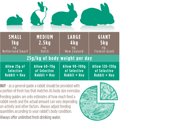 Instrucciones: Un conejo adulto promedio (aproximadamente 2,5 kg) suele consumir entre 60 y 70 gramos al día. Divida la ración en dos. Proporcione siempre heno en cantidad suficiente, agua fresca para beber y verduras frescas a diario. Almacene en un lugar fresco y seco.