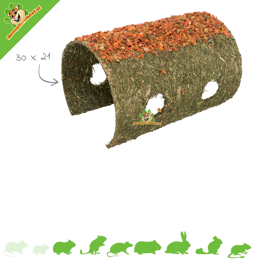 Este túnel de heno con zanahoria es el juguete todo en uno perfecto para tu roedor o conejo enano. Está hecho de heno aromático y fibras vegetales, aglomerado con almidón natural y enriquecido con una deliciosa tira de zanahoria: ¡totalmente comestible e irresistible! Ideal para mordisquear, dormir o gatear.