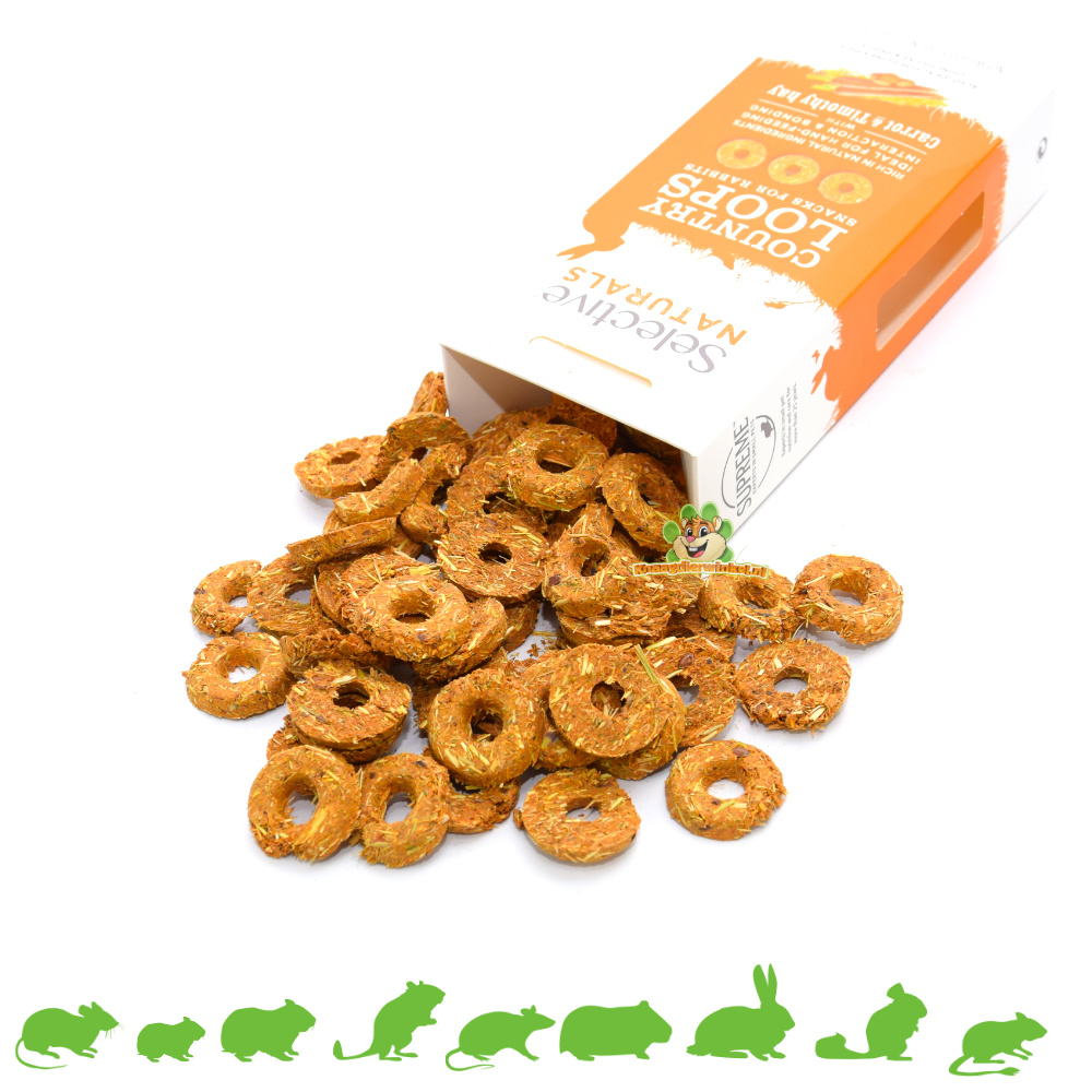 Faites plaisir à vos cochons d'Inde, lapins, octodons et chinchillas avec les granulés Supreme Selective Country Loops aux carottes et au foin de Timothy – une friandise saine et savoureuse qui rendra leur journée encore plus spéciale !
