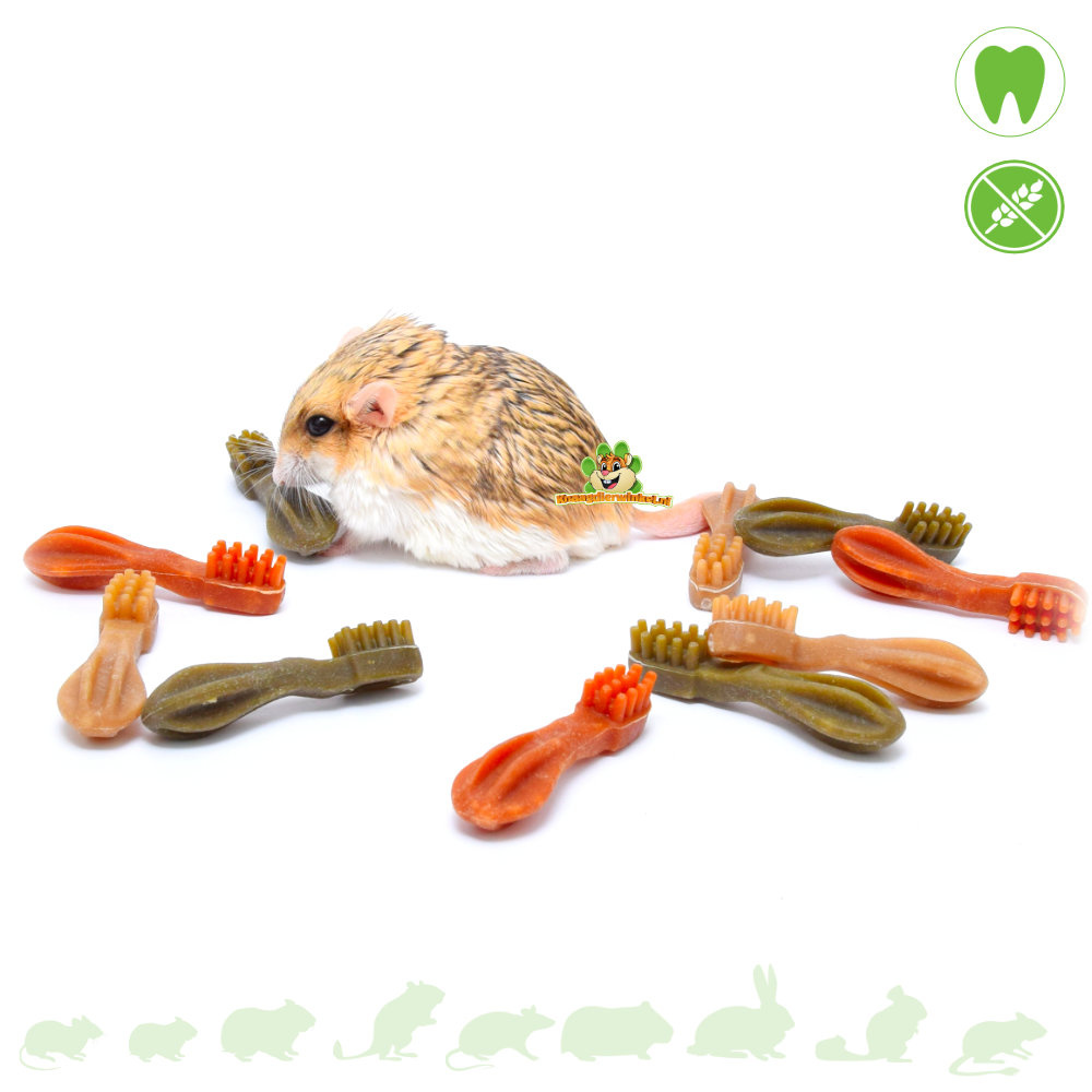 Bien que ces brosses à dents soient conçues pour les chiens, elles sont également appréciées comme collation à ronger pour les petits rongeurs. Nous déconseillons ces brosses à dents aux rongeurs et lapins herbivores.