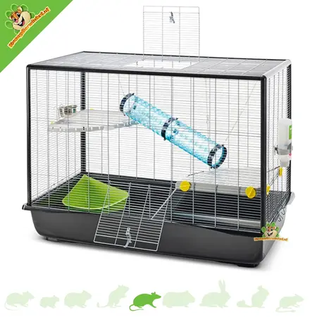 Cette cage convient comme habitat principal pour deux rats. Pour des groupes plus importants, nous recommandons une cage offrant une surface au sol plus grande et continue.